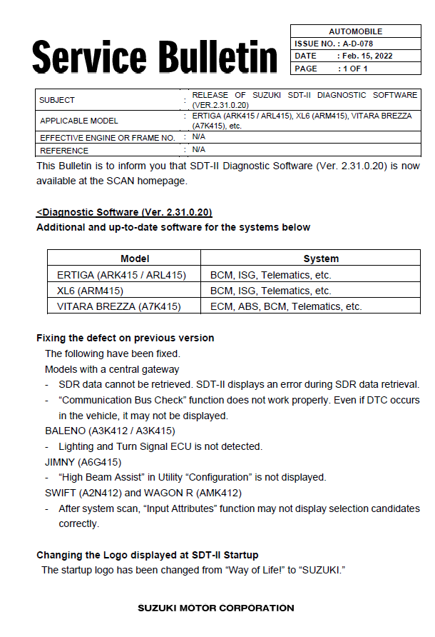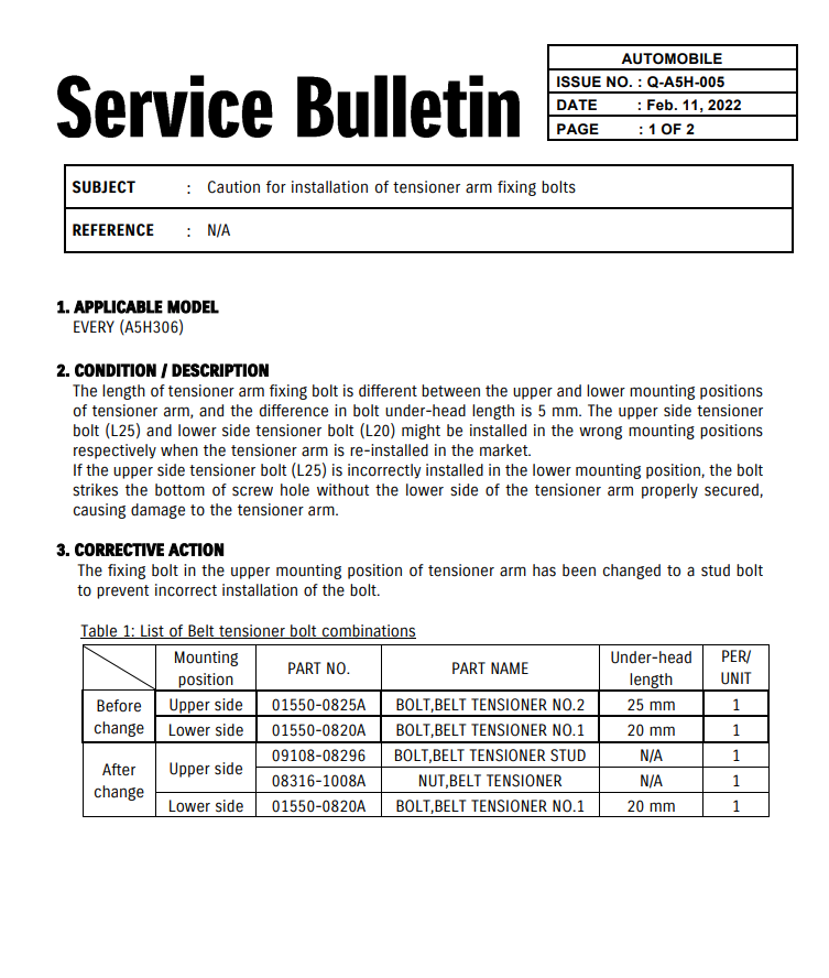 SUZUKI – Service Bulletin : Précaution à prendre pour l’installation des boulons de fixation du bras tendeur – 22022022