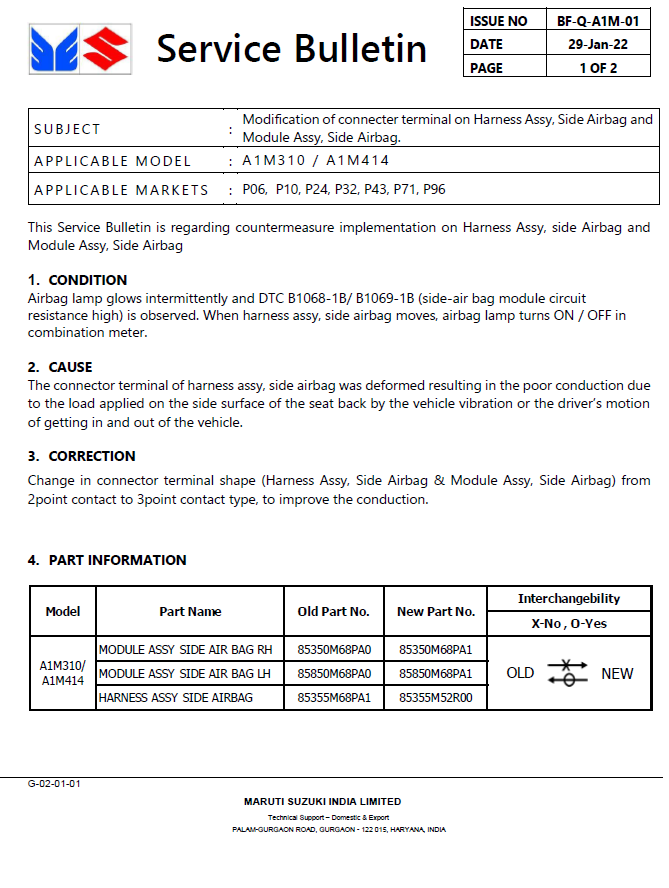 SUZUKI : Service Bulletin BF-Q-A1M-01 : Modification of connecter terminal on Harness Assy, Side Airbag and Module Assy, Side Airbag