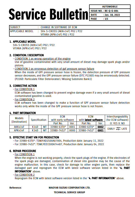 SUZUKI – Service Bulletin : change in software of ECM – BE-Q-G-084 – 18012022